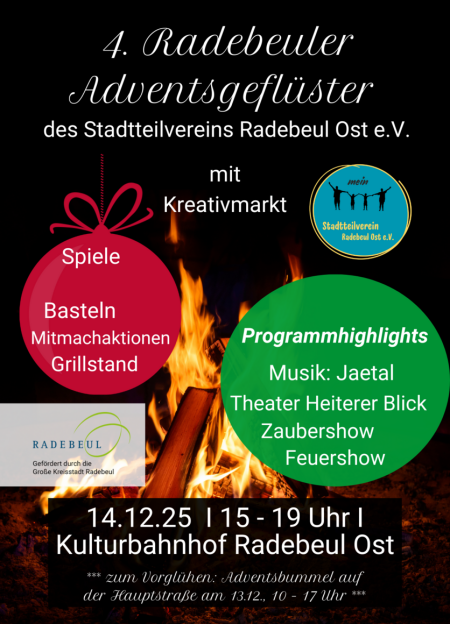 Am 14.12. dürfen Sie sich auf die mittlerweile 4. Ausgabe des traditionellen Adventsgeflüsters in Radebeul Ost freuen. Diesmal in etwas zentralerer Lage im und vorm Kulturbahnhof erwartet Sie von 15 bis 19 Uhr ein reichhaltiges kulturelles Programm. Dazu gibt es ausgesuchte kulinarische Spezialitäten mit Bratwurst, Glühwein und belgischen Waffeln. Kinder und Familien kommen bei verschiedenen Mitmachaktionen auf ihre Kosten. Außerdem können Sie auf unserem stimmungsvollen Kreativmarkt Ihr ganz persönliches Lieblingsweihnachtsgeschenk entdecken. Und natürlich wird auch die beliebte Feuerschale zum Sitzen, Verweilen und Ins-Gespräch-Kommen nicht fehlen. Wir freuen uns auf Sie!