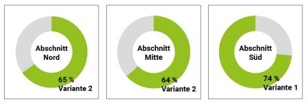 Nach Auswertung aller Rückäußerungen ist im Abschnitt Nord ein deutliches Ergebnis zugunsten der Variante 2 zu verzeichnen, in der auf eine signalisierte Querung für Radfahrer in Richtung Süden über die Güterhofstraße verzichtet wird. Dadurch reduziert sich der bauliche Aufwand zur Versetzung der Stützmauer.