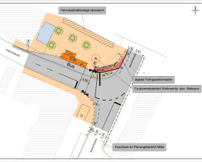 Die gestalterische Planung orientierte sich in beiden Varianten an der Gestaltungslösung, die in der Bürgerbeteiligung im Jahr 2017 von 60 % der Teilnehmenden gewählt wurde. Daraus wurden neben der Bushaltestelle mit Fahrgastunterstand die Baumstandorte, die überdachte Fahrradabstellanlage, der Standort für Weihnachtsbaum sowie der Bereich der Fliesen übernommen.