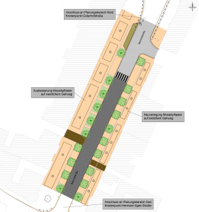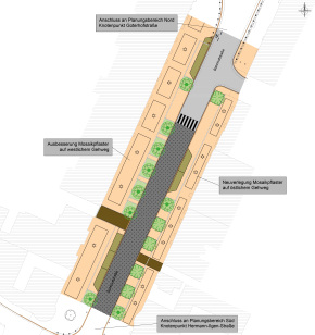 Beide Varianten zielten darauf ab, die Aufenthaltsqualität zu verbessern und den Stadtraum durch Baumneupflanzungen und Mosaikpflasterungen aufzuwerten. Nach Abstimmung mit den zuständigen Denkmalschutzbehörden muss auf der Fahrbahn der historische Wegebelag wieder eingebaut werden. Auf dem westlichen Gehweg wird er nur ausgebessert und auf der Ostseite wieder eingebaut bzw. durch gleiches Material ersetzt.