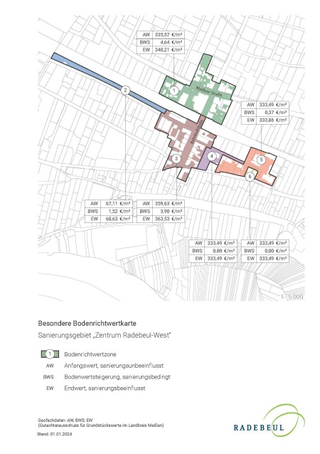 Die Bodenrichtwerte für das Sanierungsgebiet werden vom Gutachterausschuss für Grundstückswerte im Landkreis Meißen festgestellt und im Geoportal des Landkreises Meißen als Teil der Bodenrichtwertkarte für den gesamten Landkreis veröffentlicht.