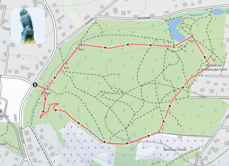 The Käuzchenweg starts at the junction of Moritzburger Straße and Kottenleite. From here, a few steps lead down to the historic forest park. The first two owl sculptures greet you here, and a plaque provides information about the trail, the history of the forest park and the artist who created the owls. A short climb leads up towards Wassertum. Here it is worth taking a look over the vineyard wall into the Elbe valley. The path continues to the mouth of the Gießmann tunnel and turns left from here towards Schwarzes Teich. Here, too, there are information boards with interesting audio tracks. From here, the trail heads back towards the starting point.