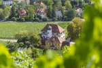 Before we reach Obere Bergstraße, it is worth taking a detour from Burgstraße to turn left into Bodelschwinghstraße and walk almost to its end, where a steep flight of steps leads up to the left (past the Haselbusch broom tavern) to below Friedensburg Castle (private property). From there, standing in the middle of the vineyard, you have a fantastic view of the Elbe valley and Radebeul.