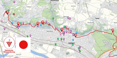 We cross Dresdner Straße, walk a short distance through the forest above the Augustusweg until we meet the Augustusweg and follow it to Radebeul, where a particularly idyllic section of the wine trail begins. Terraced vineyards with 400-year-old quarry stone walls, steep, narrow steps and winegrowers' houses are evidence of the historic winegrowing tradition.