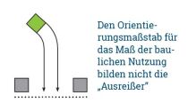 • "Outliers" in the surrounding urban space do not form the benchmark for the degree of building utilisation. Floor area, eaves and ridge heights or building heights including roof space or staggered storeys must be orientated towards the characteristic "building majority". Existing street alignments must be included.